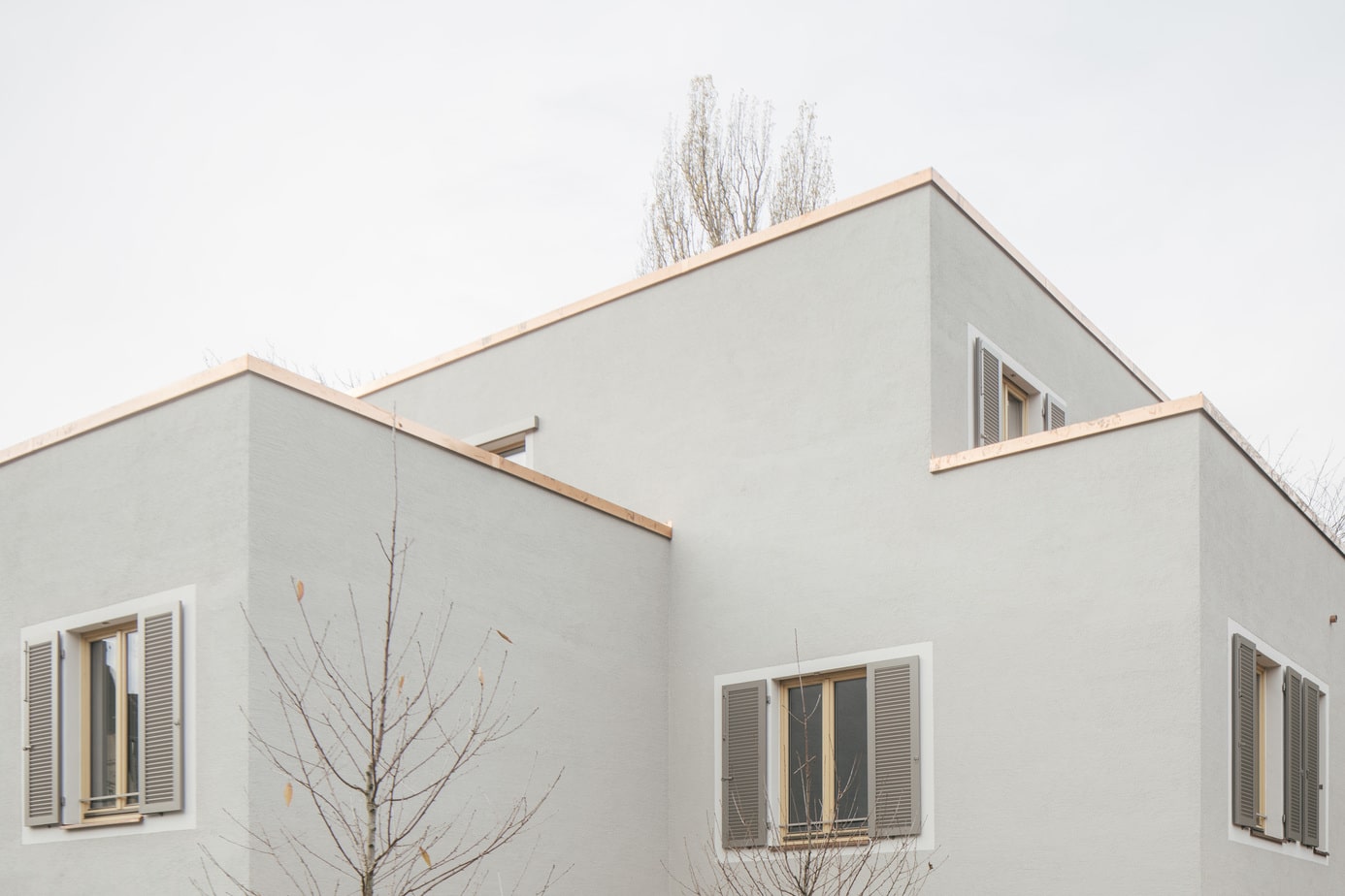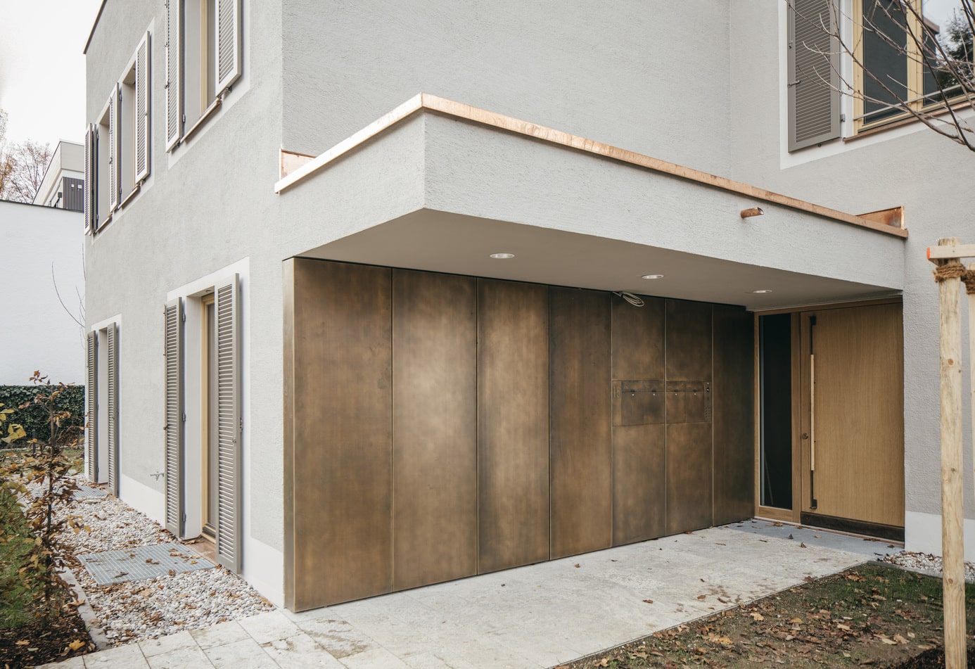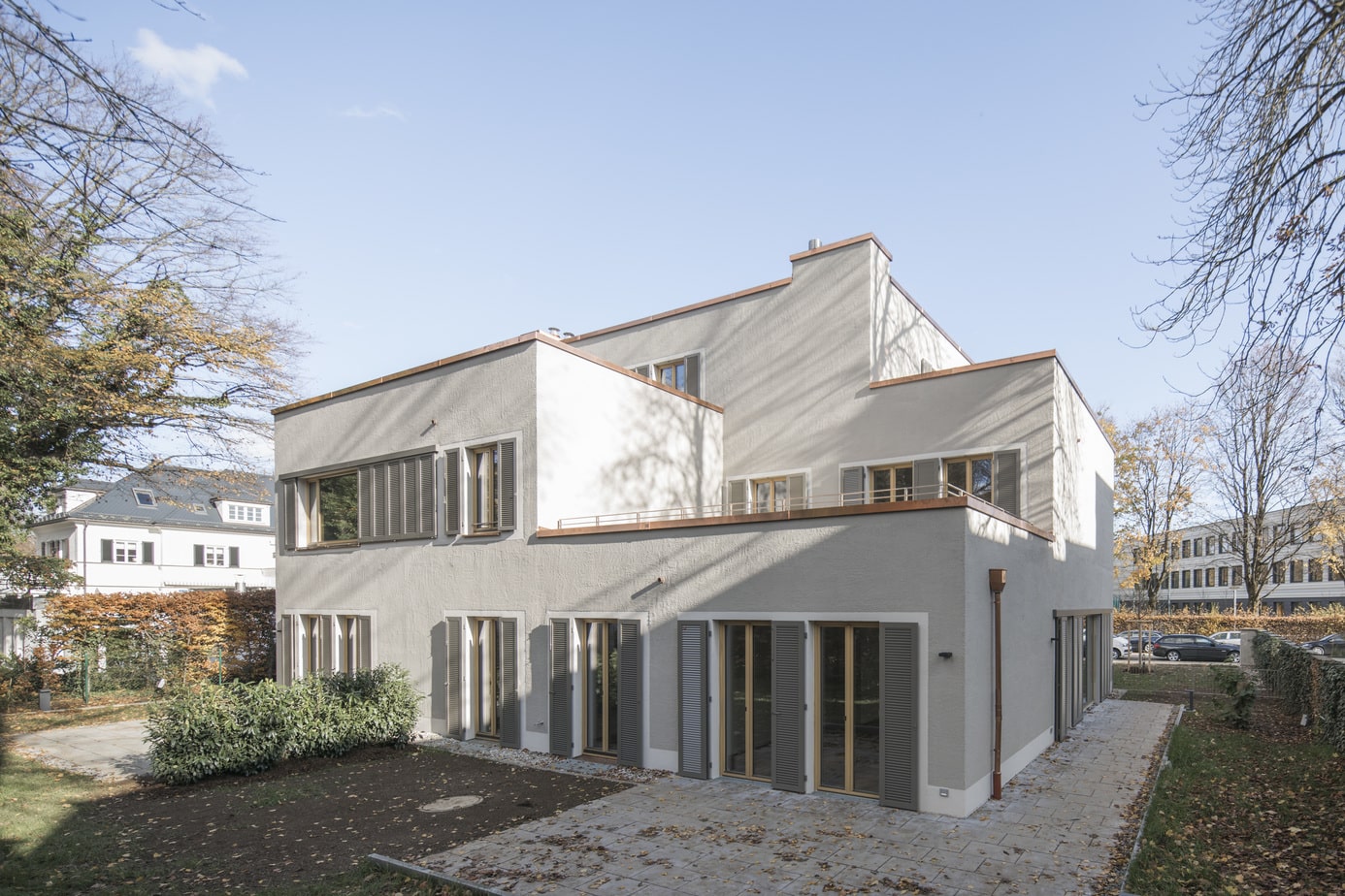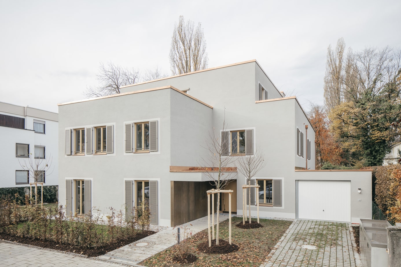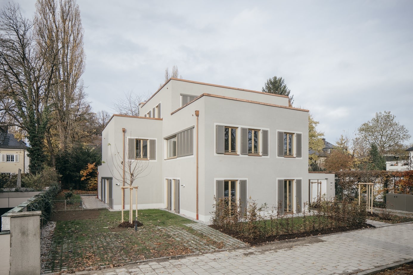 Die reduzierte Material- und Farbwahl verleihen dem skulpturalen Baukörper einen zurückhaltenden und edlen Charakter. Er fügt sich damit zeitgemäß in den Wohnformen und harmonisch im Erscheinungsbild in die historische Villenbebauung des Stadtteils ein.