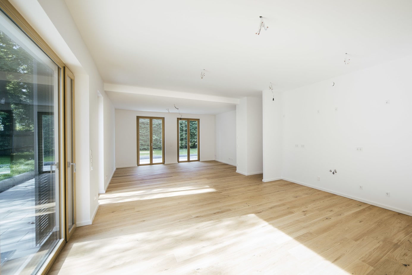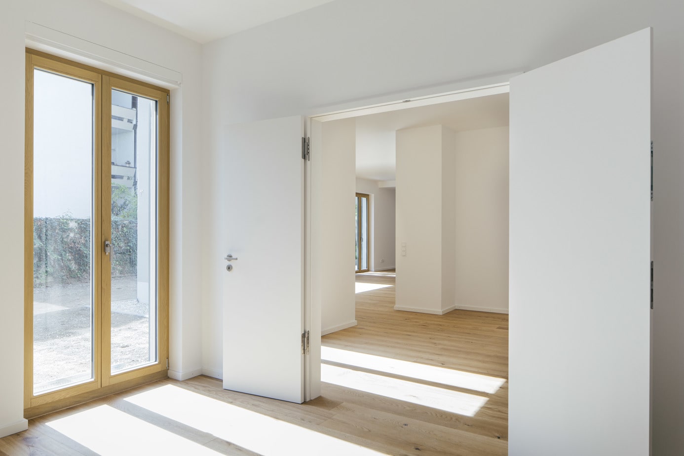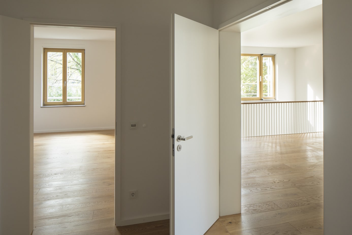 Die großflächig konzipierte Gartenwohnung ermöglicht über bodengleiche Fenstertüren barrierefreie Zugänge zu den allseitig vorgelagerten Freibereichen. Alle Wohnbereiche und Badezimmer sind rollstuhlgerecht.