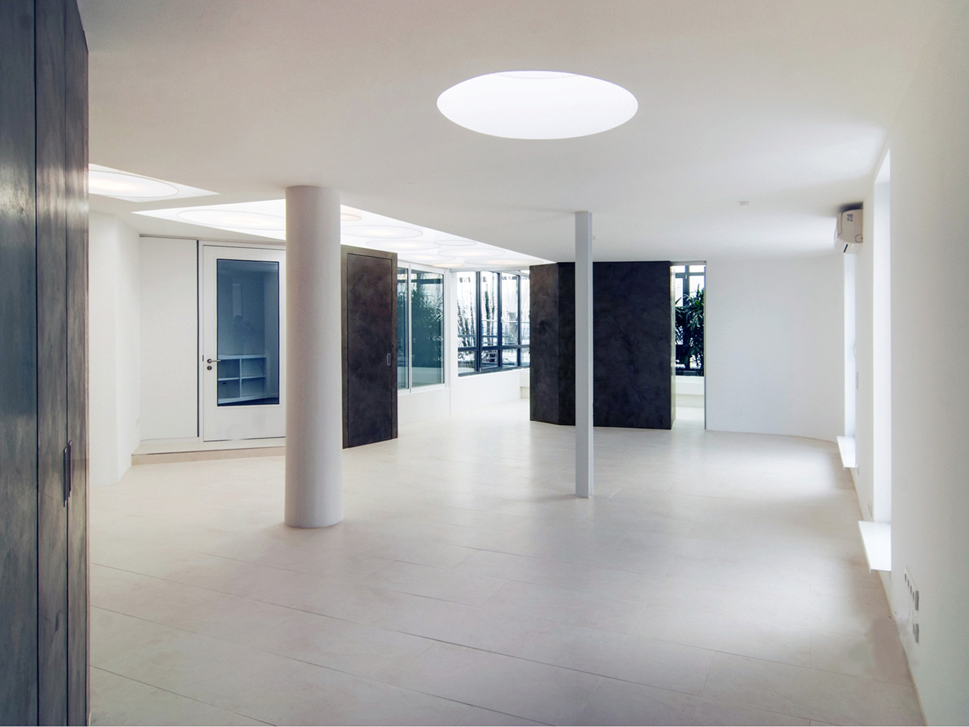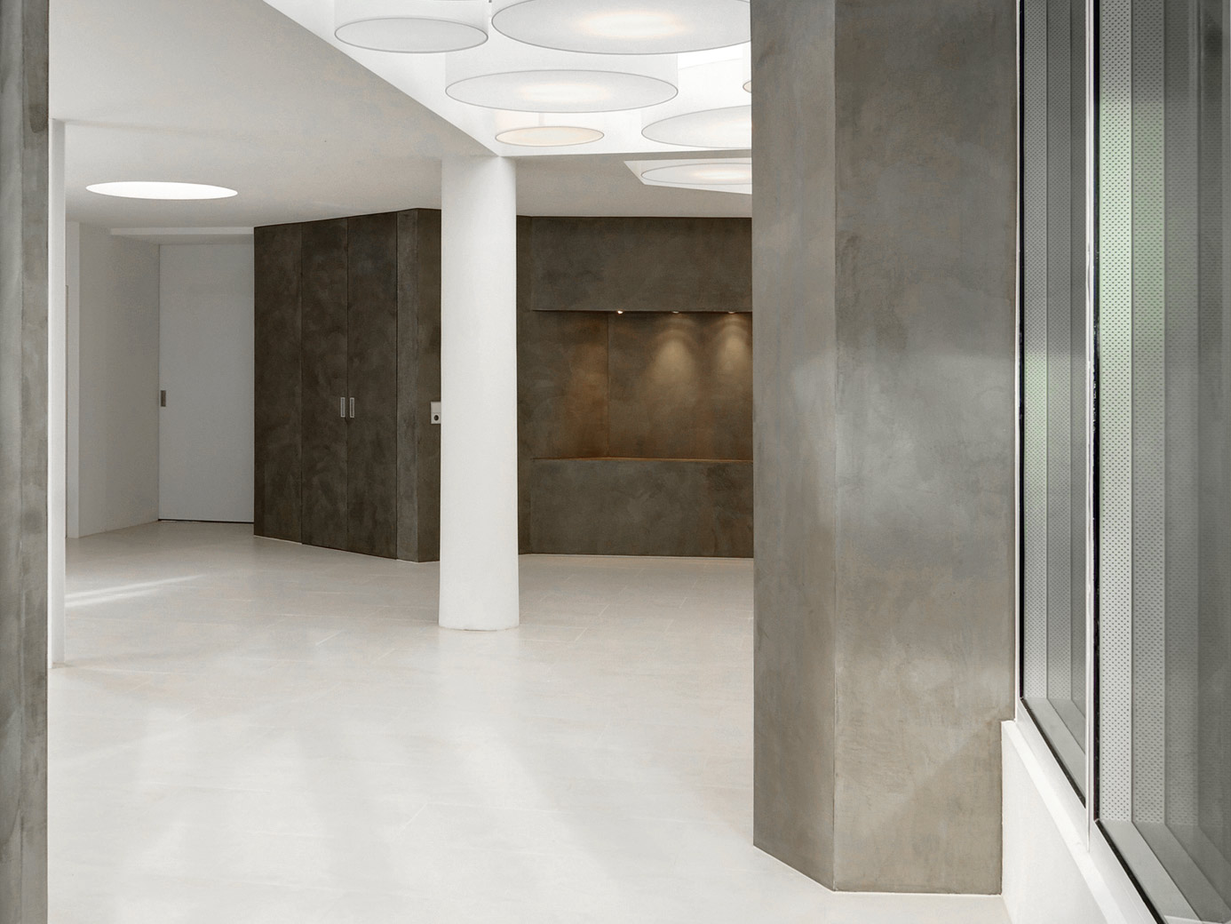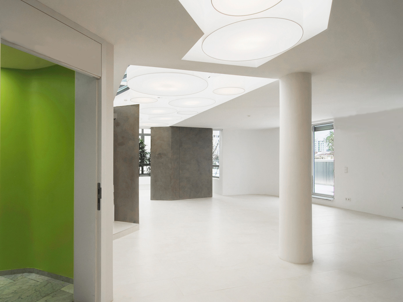 Das neue Büro zeichnet sich durch fließende Räume auf, die nur durch eingestellte Möbel und farblich abgesetzte Raumboxen zoniert werden. Glasoberlichter und große Leuchtkörper erhellen die innenliegenden Raumbereiche.