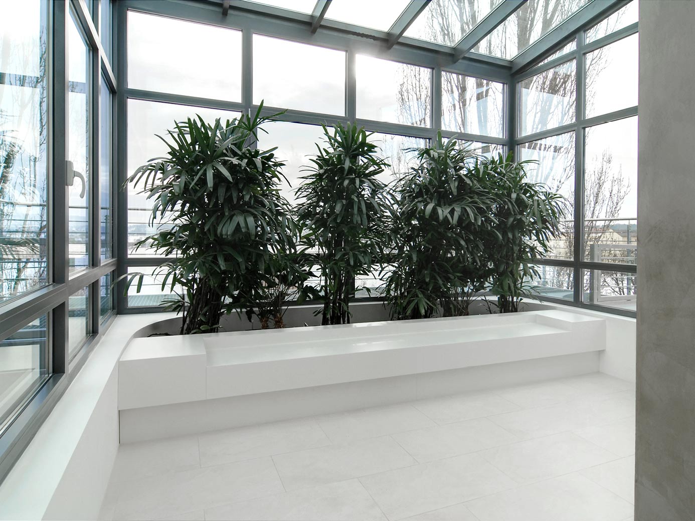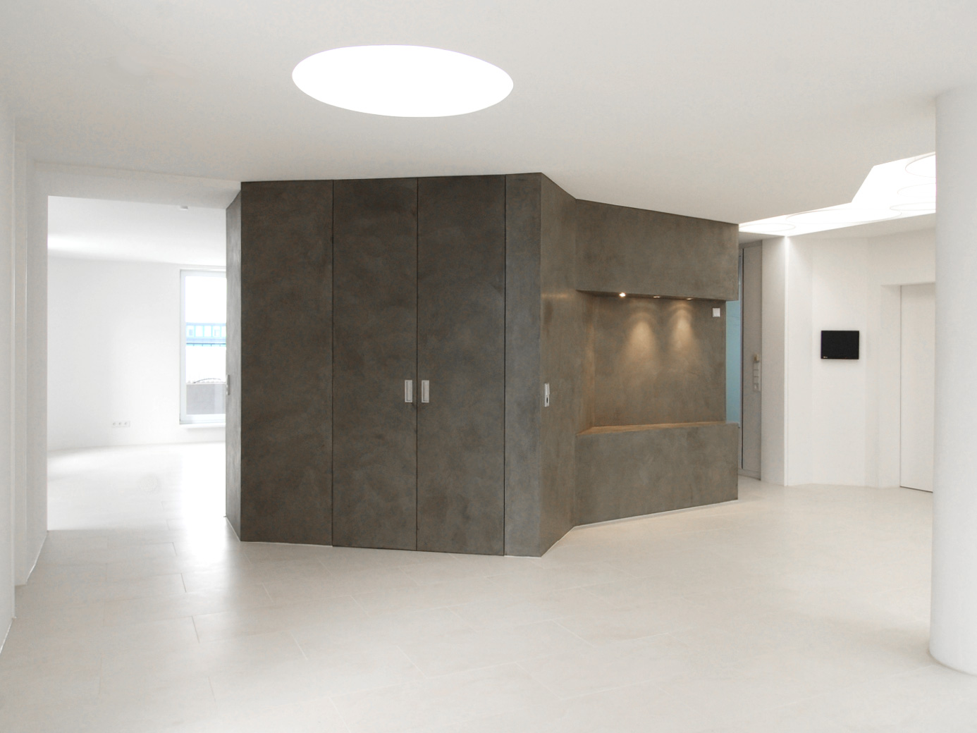 Das mehrgeschossige Bürogebäude wurde in den 1980-er Jahren in einem Gewerbegebiet nahe Stuttgart errichtet. Die ehemalige Wohnung im Penthouse wurde zu einer Büroeinheit umgebaut.