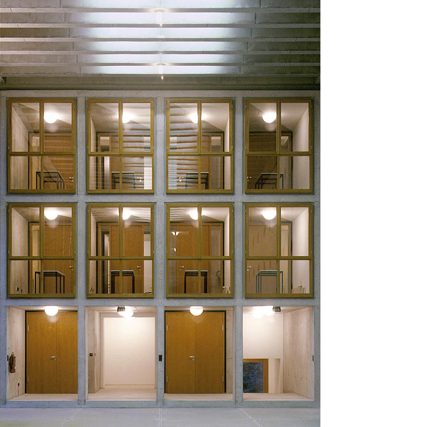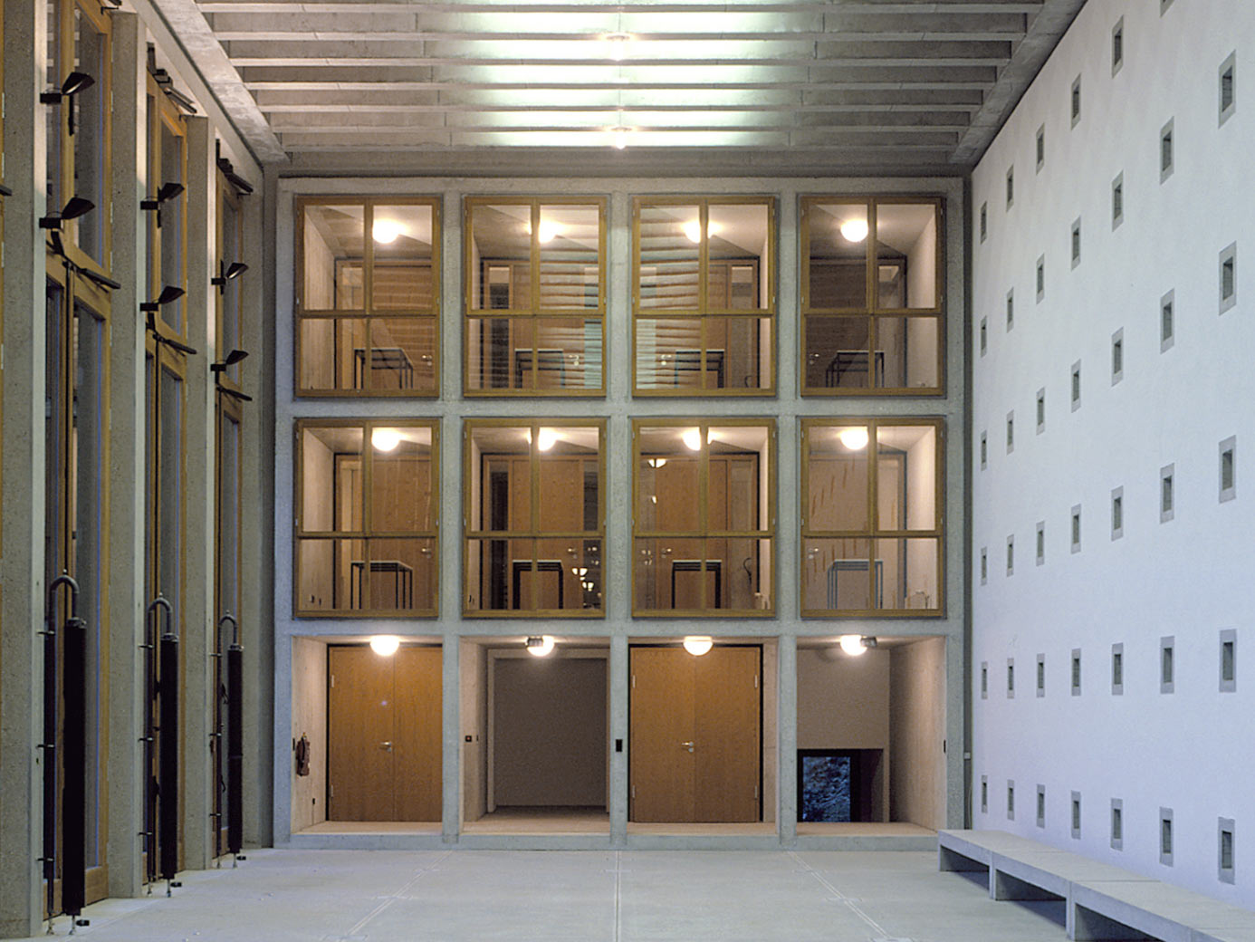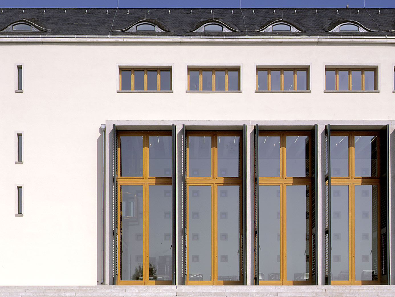 Die in den Räumen eines Schlosses untergebrachten Hörsäle und Seminarräume mussten erweitert werden. Nach dem Entwurf von Prof. Christoph Mäckler entstand im benachbarten Weingarten ein Erweiterungsbau der 4 Hörsäle, die Universitätsbibliothek, mehrere Studienräume sowie die 3-geschossige Aula beherbergt. Die reduzierte Auswahl der Baustoffe erfolgte in Analogie zu den vorgefundenen Materialien der historischen Nachbargebäude. Gestockter Sichtbeton, Eichenholz und dunkel gestrichener Stahl verleihen dem Haus eine würdevolle Atmosphäre in der historischen Nachbarschaft.