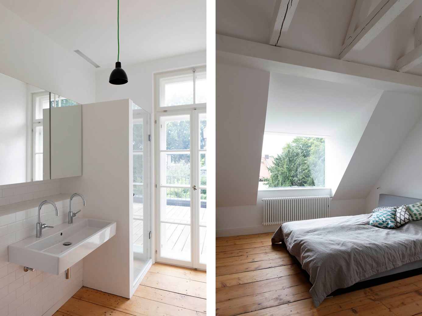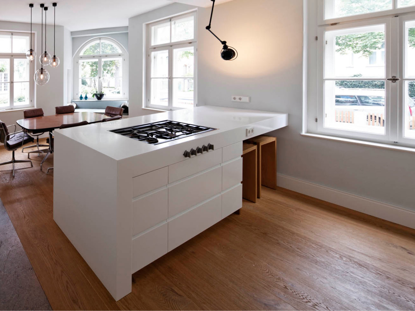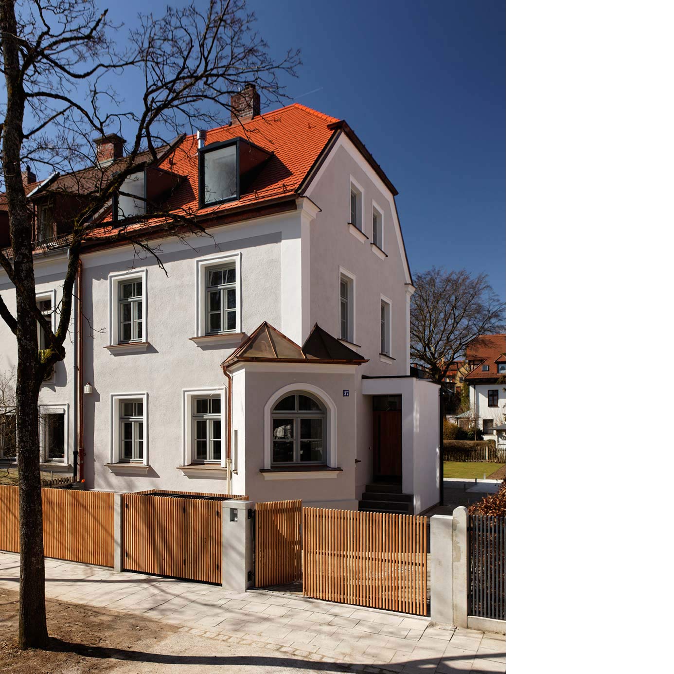 In Absprache mit der Denkmalschutzbehörde wurde ein Konzept für die Instandsetzung, Sanierung und Modernisierung des Hauses ausgearbeitet. Die historische Bausubstanz wurde restauriert, die ursprüngliche räumliche Struktur wieder hergestellt, historische Bauelemente und handwerkliche Details wieder sichtbar gemacht. Die Fassade erhielt Ihren ursprünglichen Charakter durch den Einbau von Kastenfenstern zurück. Moderne Gläser gewährleisten die Erfüllung zeitgemäßer energetischer Anforderungen.