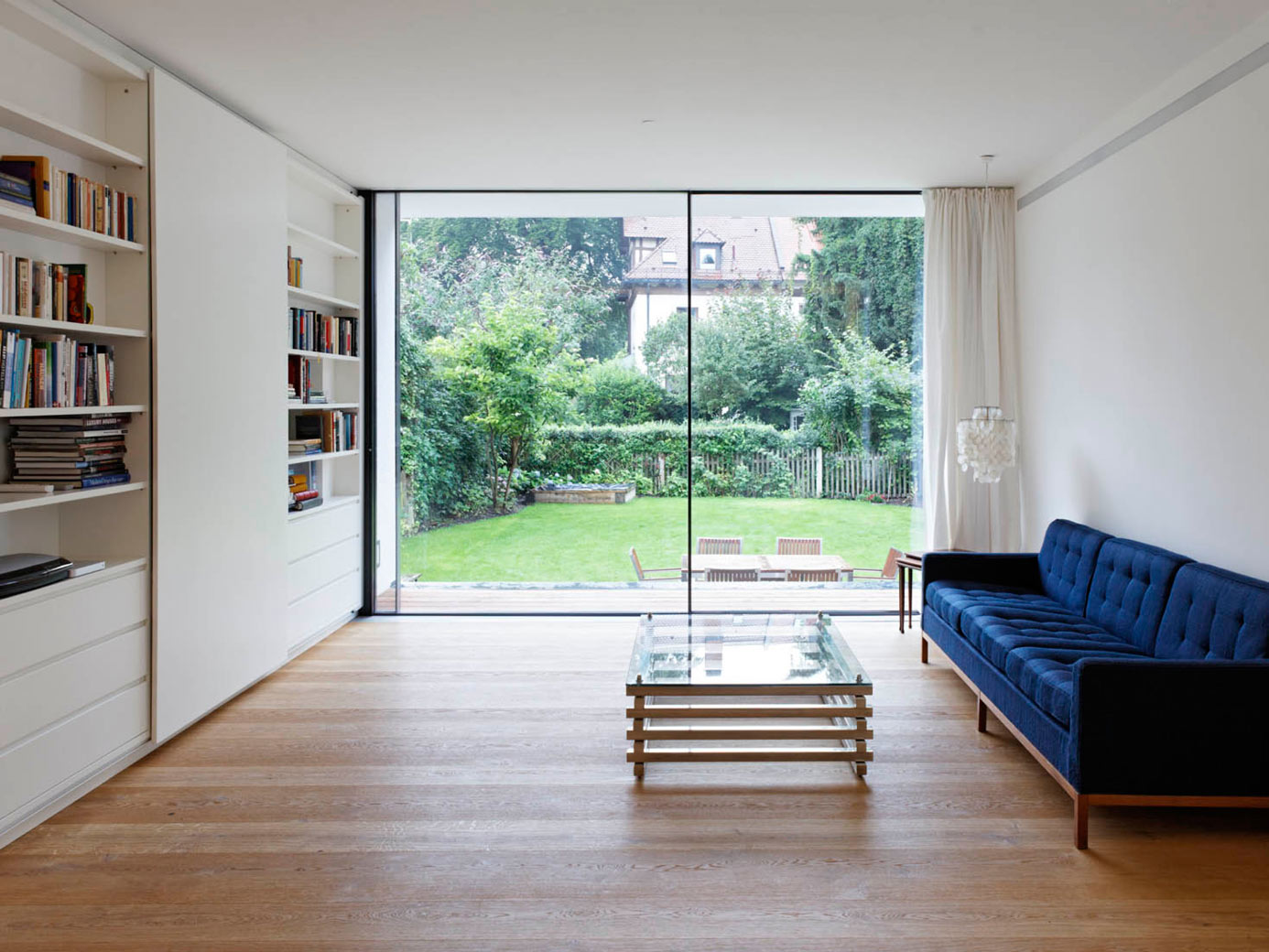 Große Glasschiebetüren mit reduzierten Rahmen verbinden die Wohnfläche im EG mit dem Freibereich.